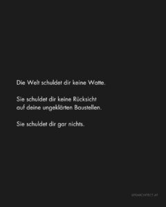 Echt jetzt. Dieses ewige „Der hat mich getriggert“, „Das hat mich verletzt“, „Die Welt ist so unsensibel“. Ja, willkommen im Leben. Das ist kein Wellnesshotel.