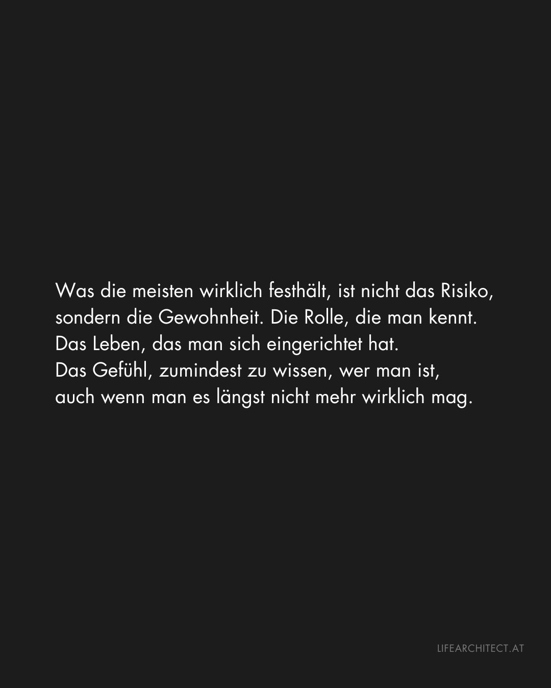 Was die meisten wirklich festhält, ist nicht das Risiko, sondern die Gewohnheit. Die Rolle, die man kennt. Das Leben, das man sich eingerichtet hat. Das Gefühl, zumindest zu wissen, wer man ist, auch wenn man es längst nicht mehr wirklich mag.